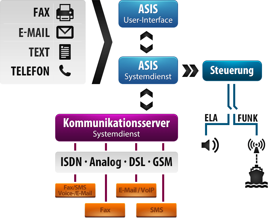 Integriert in ASIS sind diverse Schnittstellen zu allen bekannten Kommunikations- und ELA-Systemen.