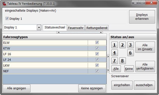 Die Auswahl der angezeigten Seite sowie die selektive Auswahl einzelner Fahrzeugtypen und Statuswerte erfolgt über FMSRemote, eine Fernbedienung, die auf jedem Arbeitsplatz installiert werden kann.