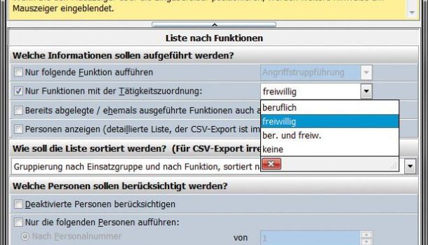 Ist eine Person sowohl beruflich als auch freiwillig in der Organisation tätig, wird für die Person nur ein Karteiblatt angelegt. Alle Informationen lassen sich kennzeichnen, ob diese beruflich, freiwillig oder wie z. B. die G26-Untersuchung für beide Organisationstypen gültig sind.