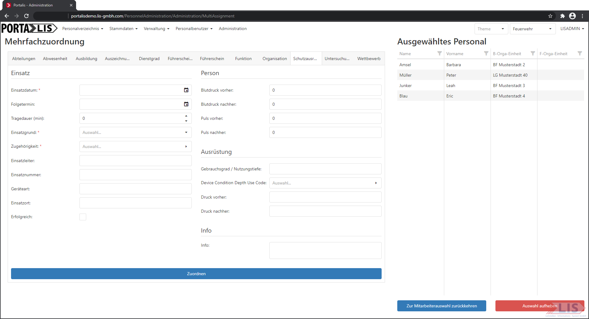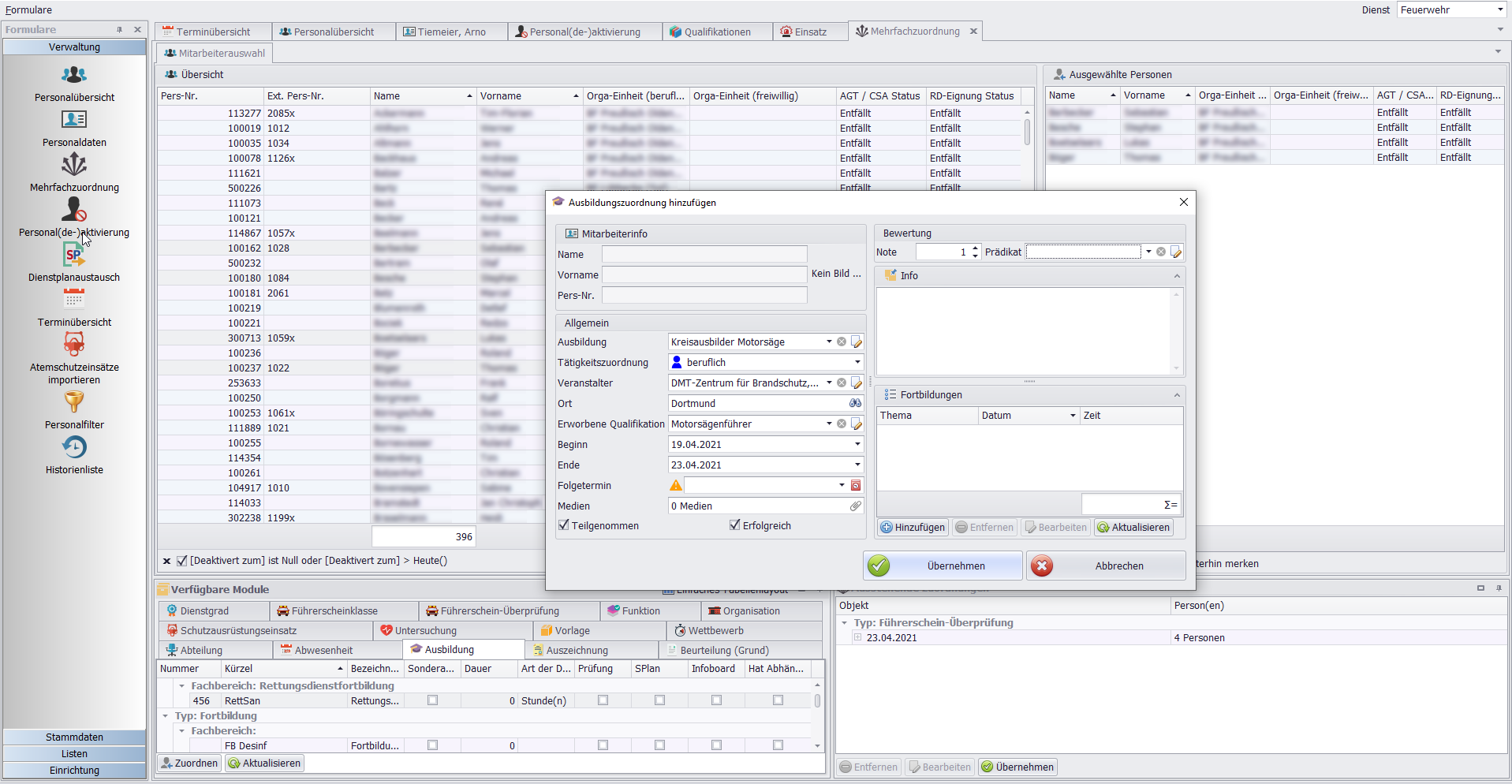 Um tägliche Routinearbeiten zu optimieren, stehen spezielle Formulare zur Verfügung. Wenn das gleiche Ereignis (Lehrgang, Wettbewerb, Untersuchung usw.) mit identischen Angaben mehreren Personen zuzuordnen ist, kann dieses schnell mit der Mehrfachzuordnung erfolgen.