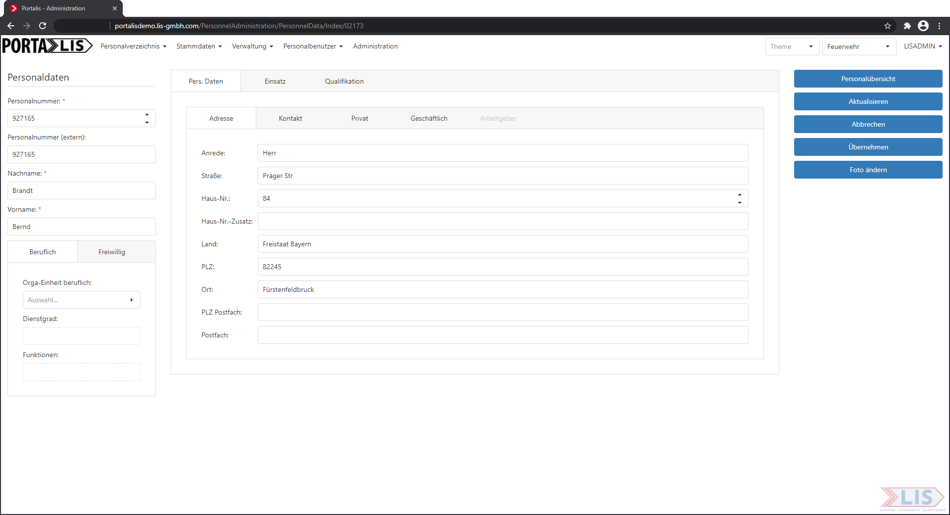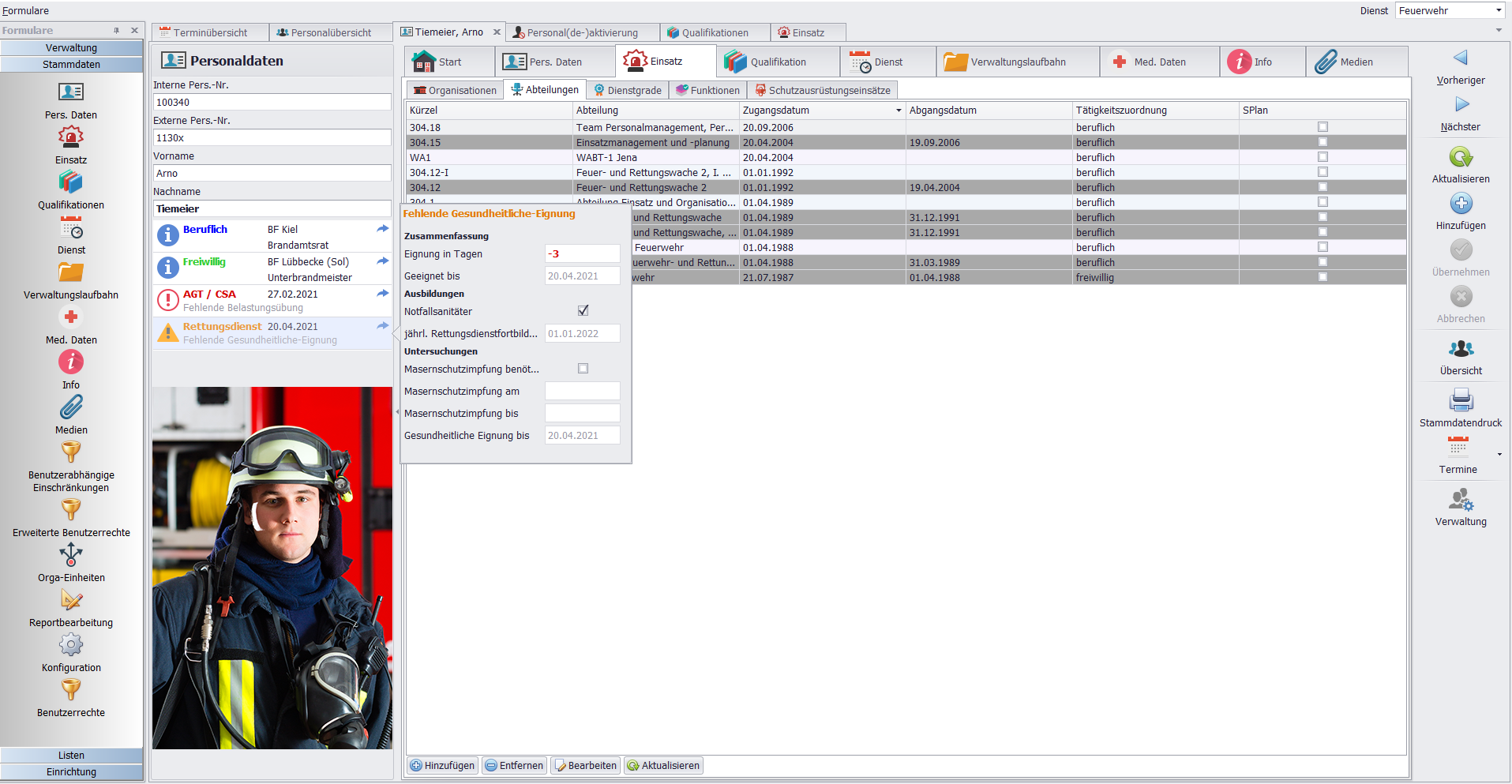 Mit der Personalverwaltung können alle dienstlich relevanten Daten einer Person gespeichert werden. Hierzu gehören u. a. Ausbildungen, Qualifikationen, Untersuchungstermine, Führerscheine. Jeder Eintrag kann mit der Zusatzinformation versehen werden, ob dieser aufgrund einer freiwilligen oder beruflichen Tätigkeit erfolgt. Eine Person, die freiwillig und beruflich in einer Organisation tätig ist, hat somit nur ein Stammblatt.