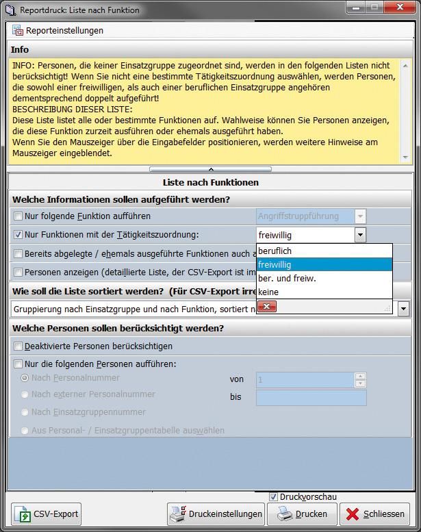 Für den Bereich Funktionen können Schablonen definiert werden, so dass den Personen nach einer erfolgten Ausbildung die möglichen taktischen Funktionen mit einem Klick zugeordnet werden können.